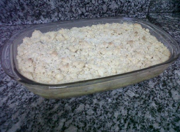 Misture tudo com as mãos e aperte até virar uma farofa. Coloque metade da farofa na travessa e todo o creme. Cubra com o restante da farofa. Leve ao forno 180° até dourar. Para diversificar, coloque pedaços de chocolate, doce de leite, frutas cristalizadas, passas, etc, antes de cobrir com a farofa.