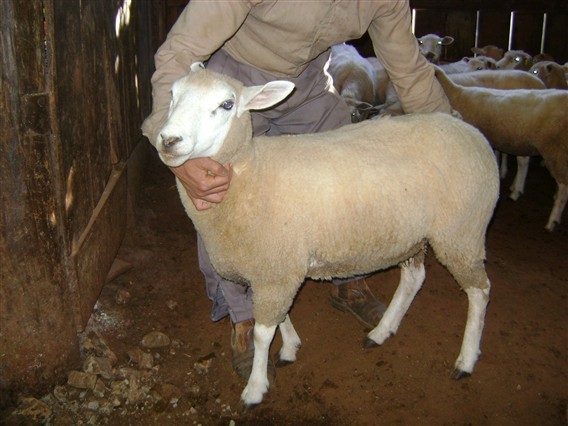 Borrega cruza Texel(2 dentes), sendo selecionada para o rebanho comercial da Fazenda